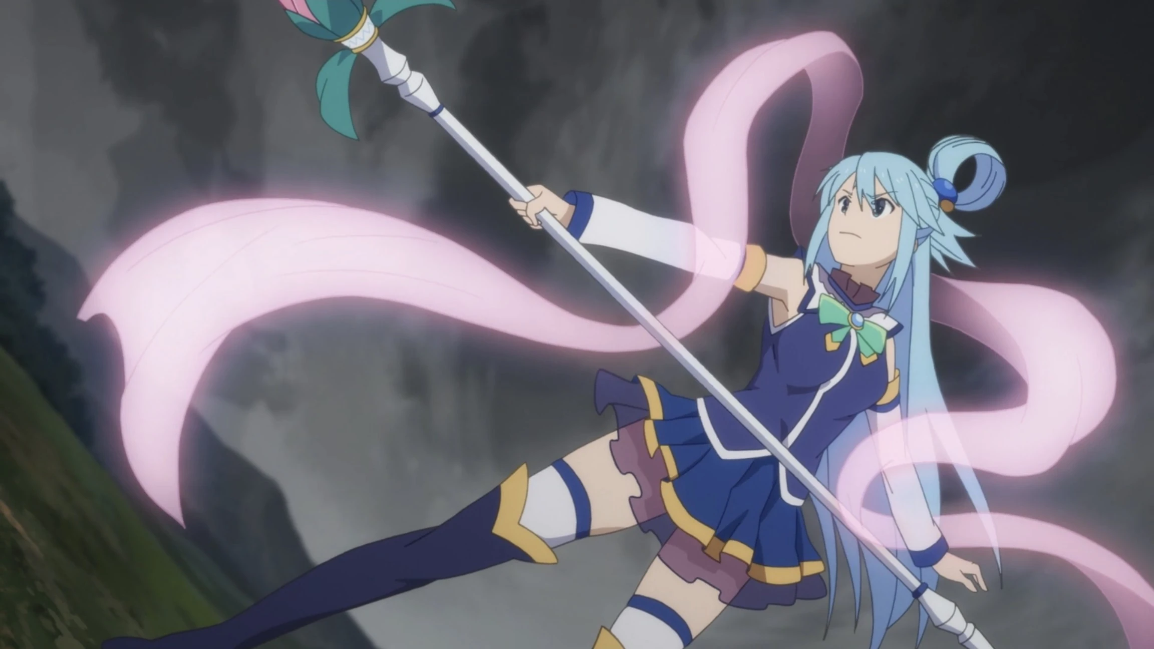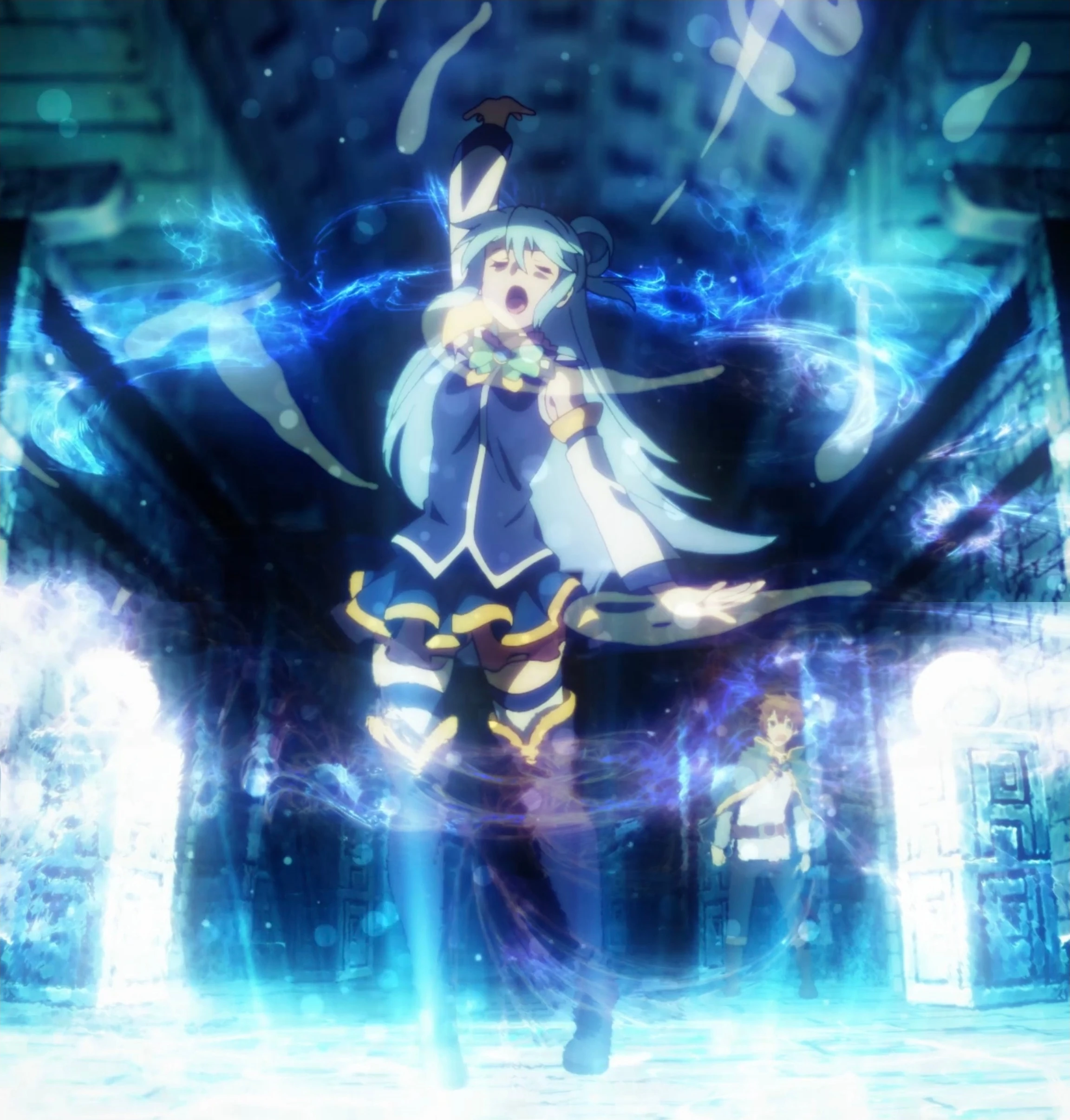Holy Magic: Upon descending into the mortal plane, Aqua took up the Arch Priest-class, learning all her class skills, allowing her to use all types of healing and recovery spells, support buffs, and evil-dispeling magic.